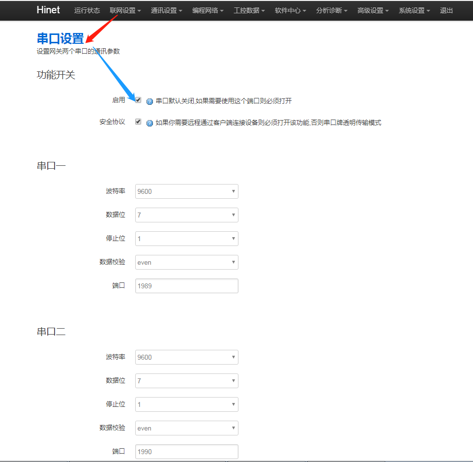 1. 如果是串口PLC,檢查串口是否打開(kāi),以及串口的端口是否正確,進(jìn)網(wǎng)關(guān)后臺(tái)“通訊設(shè)置 - 串口設(shè)置”,勾選【啟用】,串口一的端口為1989,串口二的端口為1990。
