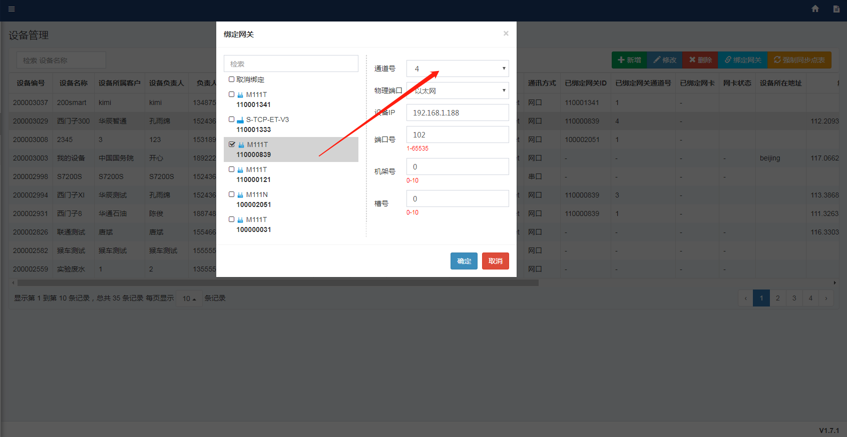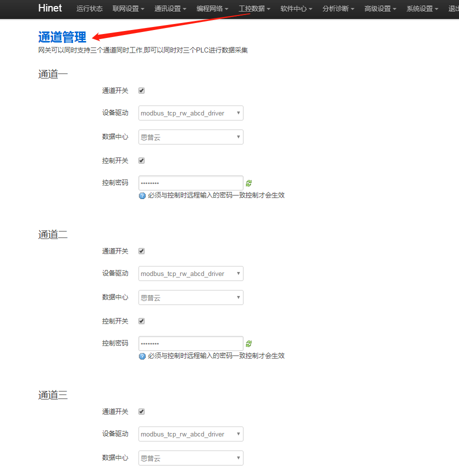 2. 后臺通道與平臺上所選通道不一致,網(wǎng)關(guān)后臺“工控數(shù)據(jù) - 通道管理”打開的是通道1,思普云平臺設(shè)備管理處,設(shè)備綁定網(wǎng)關(guān)時通道選擇1。