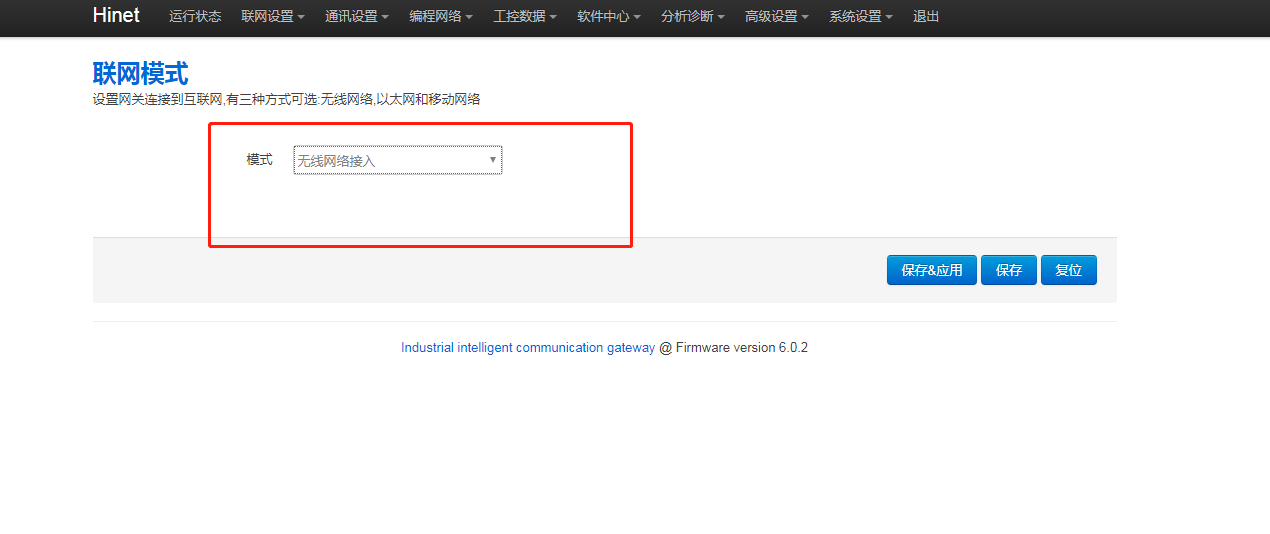 1. 網(wǎng)關(guān)后臺聯(lián)網(wǎng)模式是否正確,進網(wǎng)關(guān)后臺,點擊“聯(lián)網(wǎng)設(shè)置 - 聯(lián)網(wǎng)模式”,修改模式為“無線網(wǎng)絡(luò)接入”,再點擊【保存應(yīng)用】,重啟網(wǎng)關(guān)生效。