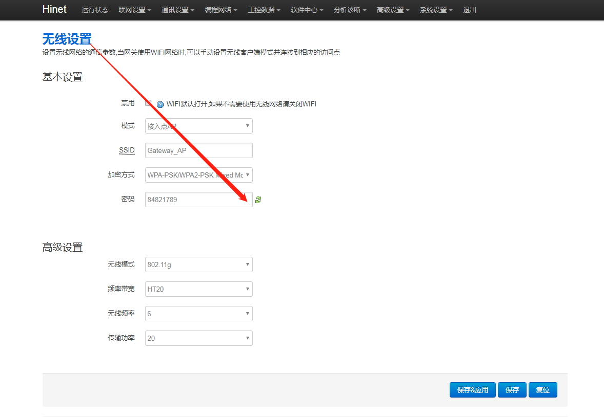 2.WIFI密碼是否正確,進網(wǎng)關(guān)后臺,點擊“通訊設(shè)置 - 無線設(shè)置”,點擊顯示密碼圖標(biāo),確認(rèn)密碼。