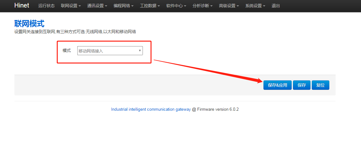 1. 網(wǎng)關(guān)后臺(tái)聯(lián)網(wǎng)模式是否正確,進(jìn)網(wǎng)關(guān)后臺(tái),點(diǎn)擊“聯(lián)網(wǎng)設(shè)置 - 聯(lián)網(wǎng)模式”,修改模式為“移動(dòng)網(wǎng)絡(luò)接入”,再點(diǎn)擊【保存應(yīng)用】,重啟網(wǎng)關(guān)生效。