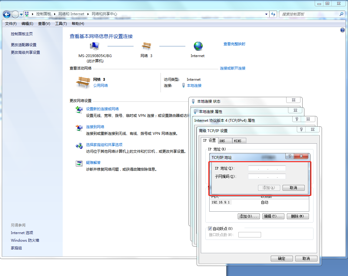 點(diǎn)擊“開(kāi)始 - 控制面板 – 網(wǎng)絡(luò)和Internet - 網(wǎng)絡(luò)和共享中心 - 更改設(shè)備適配器”找到物理網(wǎng)卡,鼠標(biāo)右擊“屬性”,選擇Internet 協(xié)議版本 4 (TCP/IPv4),點(diǎn)擊“屬性”,添加一個(gè)同網(wǎng)段IP。